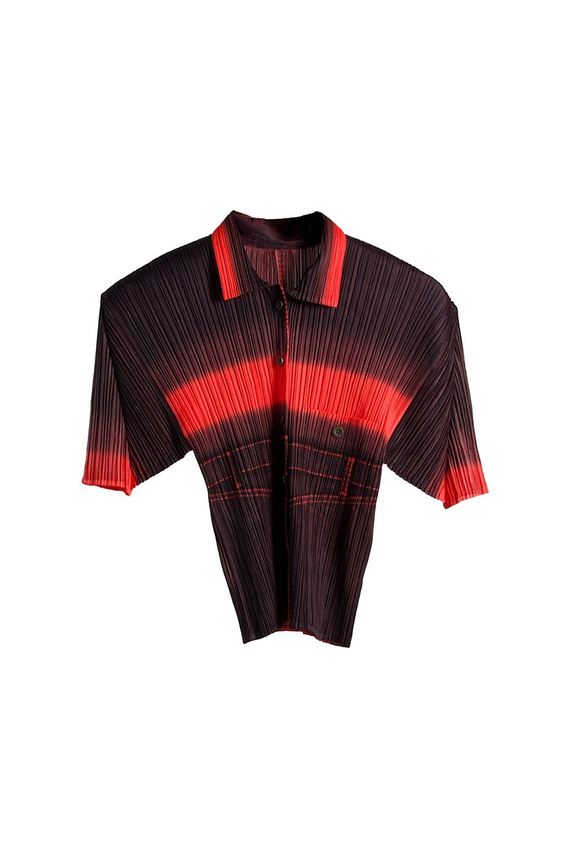 RED WASHED DENIM PRINT BUTTON FRONT SHORTSLEEVE SHIRT